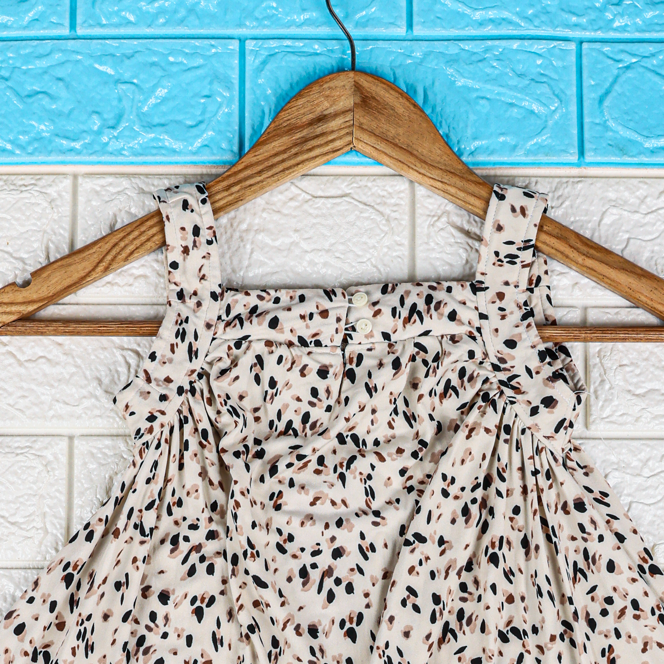Crafted from lightweight and breathable fabric, this charming frock ensures your child stays cool and comfortable all day long. The sleeveless design with broad shoulder straps adds a trendy touch while allowing free movement and ease of wear. The gathered pleats on the bodice enhance its graceful shape, creating a perfect blend of cuteness and comfort.