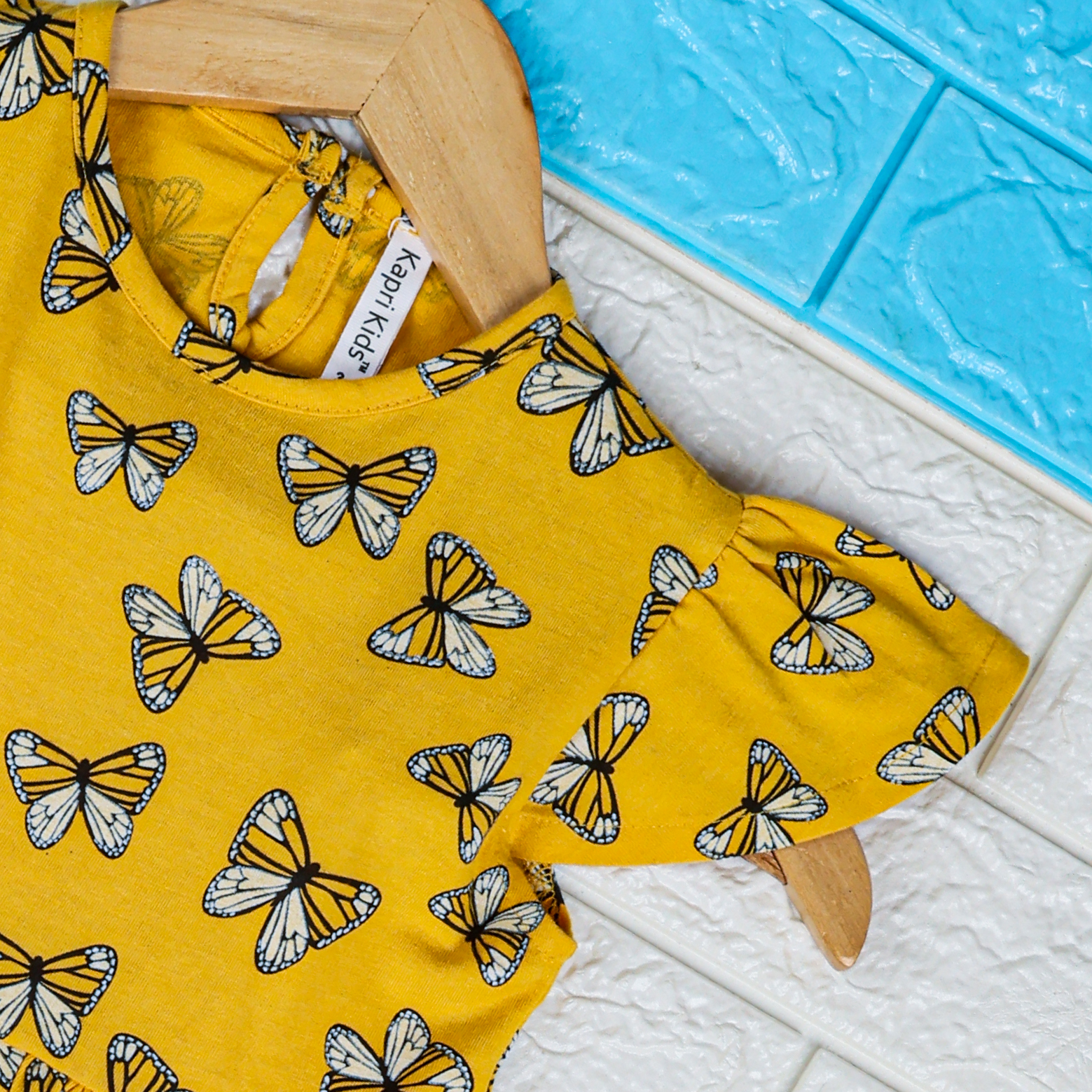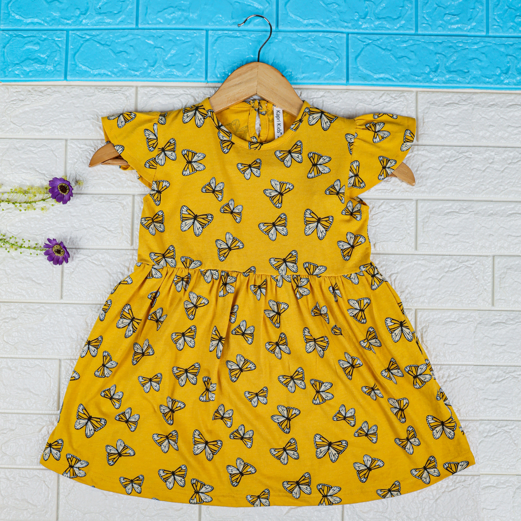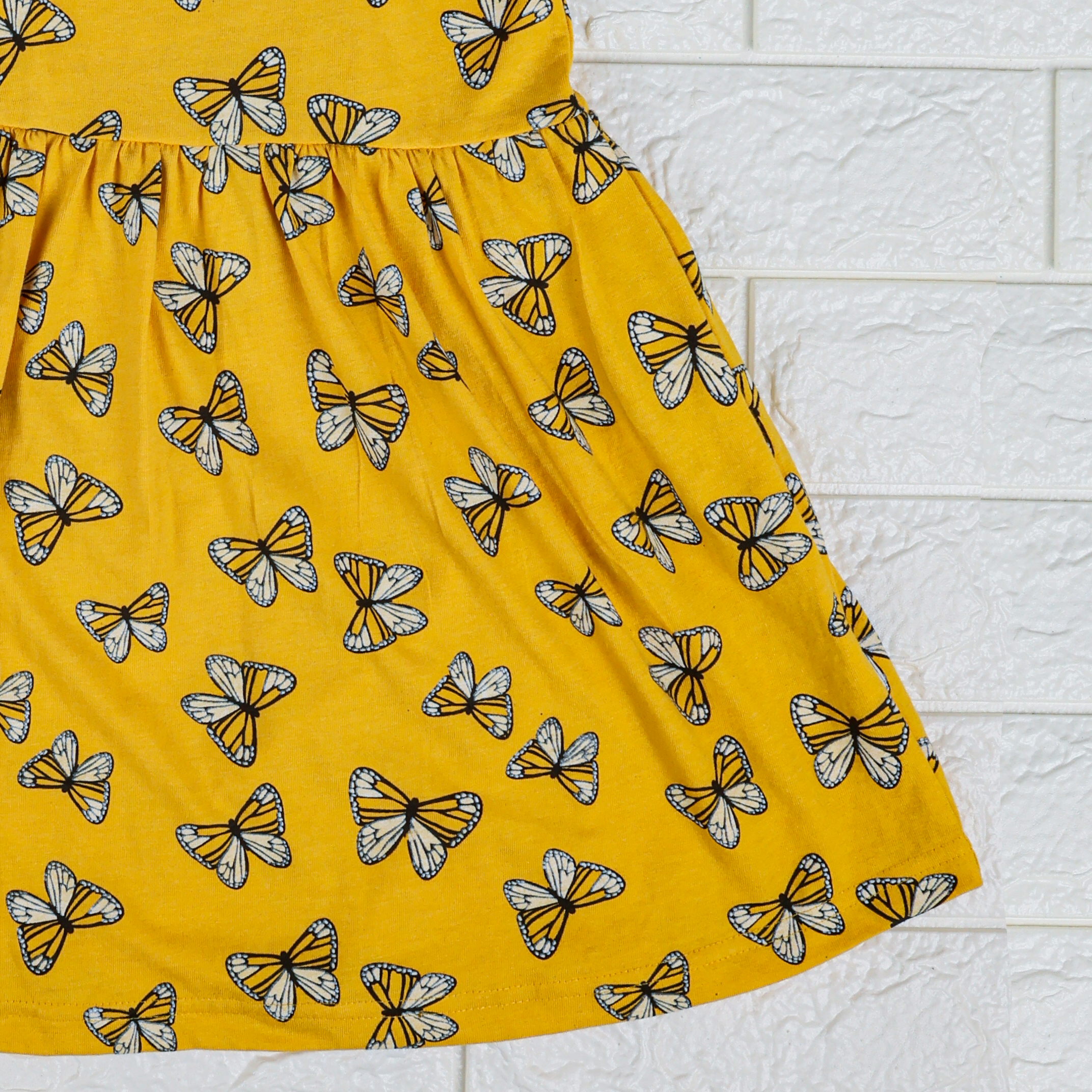 Bright yellow cotton frock with cute all-over butterfly print, flutter sleeves, and gathered waist — perfect for everyday wear or special outings.