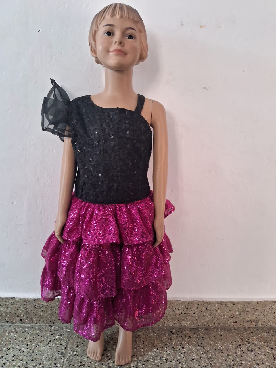 The skirt portion is a vibrant pop of pink, designed with multiple cascading ruffled layers covered in sparkling sequins that shimmer with every move. Perfect for birthday parties, stage performances, or festive celebrations, this frock is all about glitz, glam, and confidence.