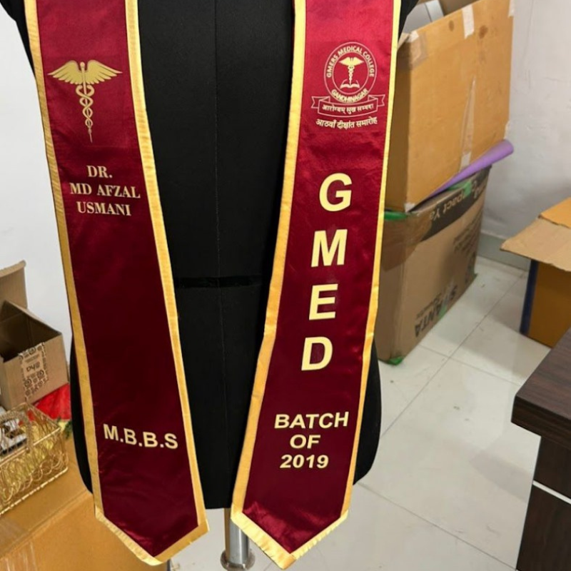 This maroon and gold graduation stole is tailored for graduates. With details like the graduate’s name, degree , and batch year, it is both personal and professional—ideal for convocation events.