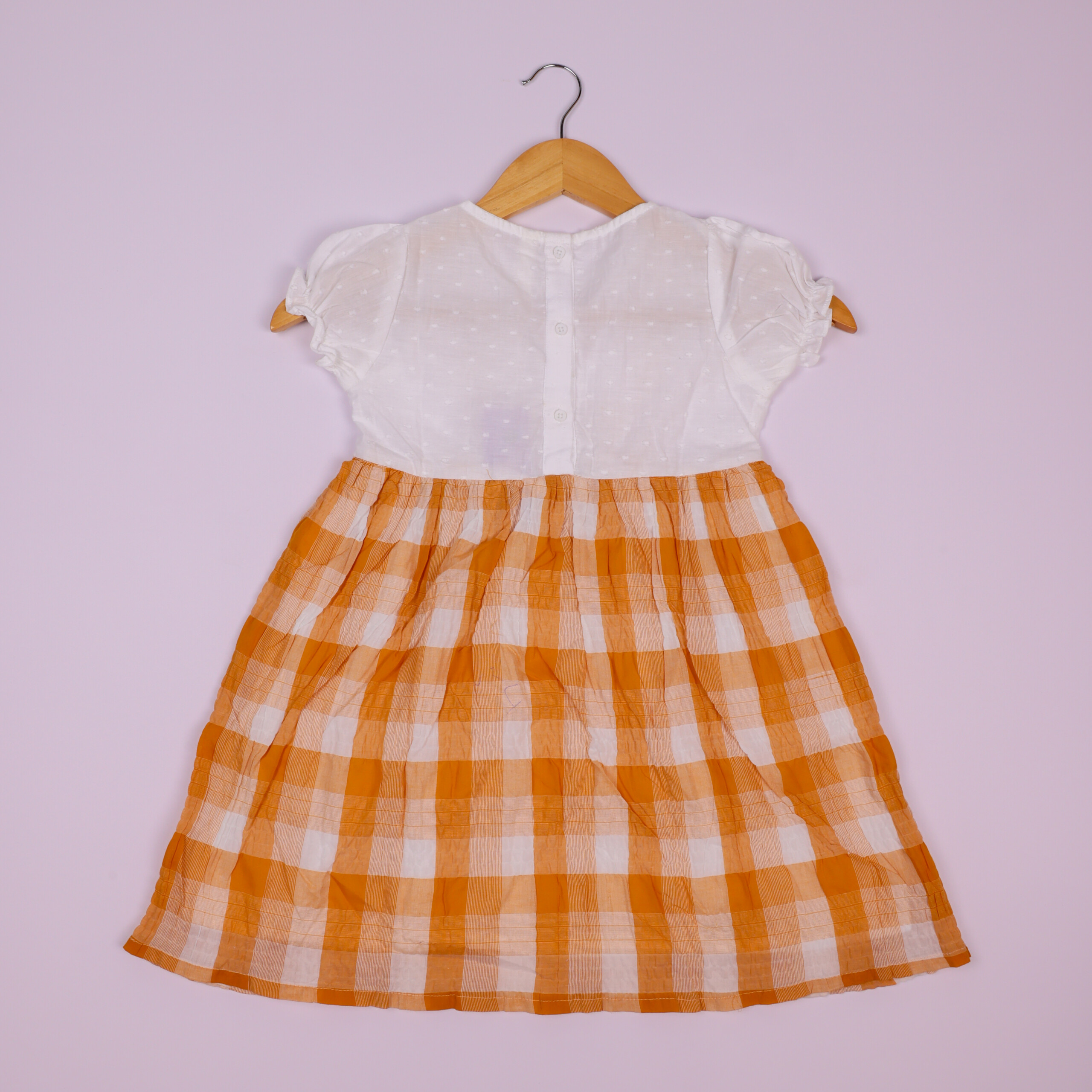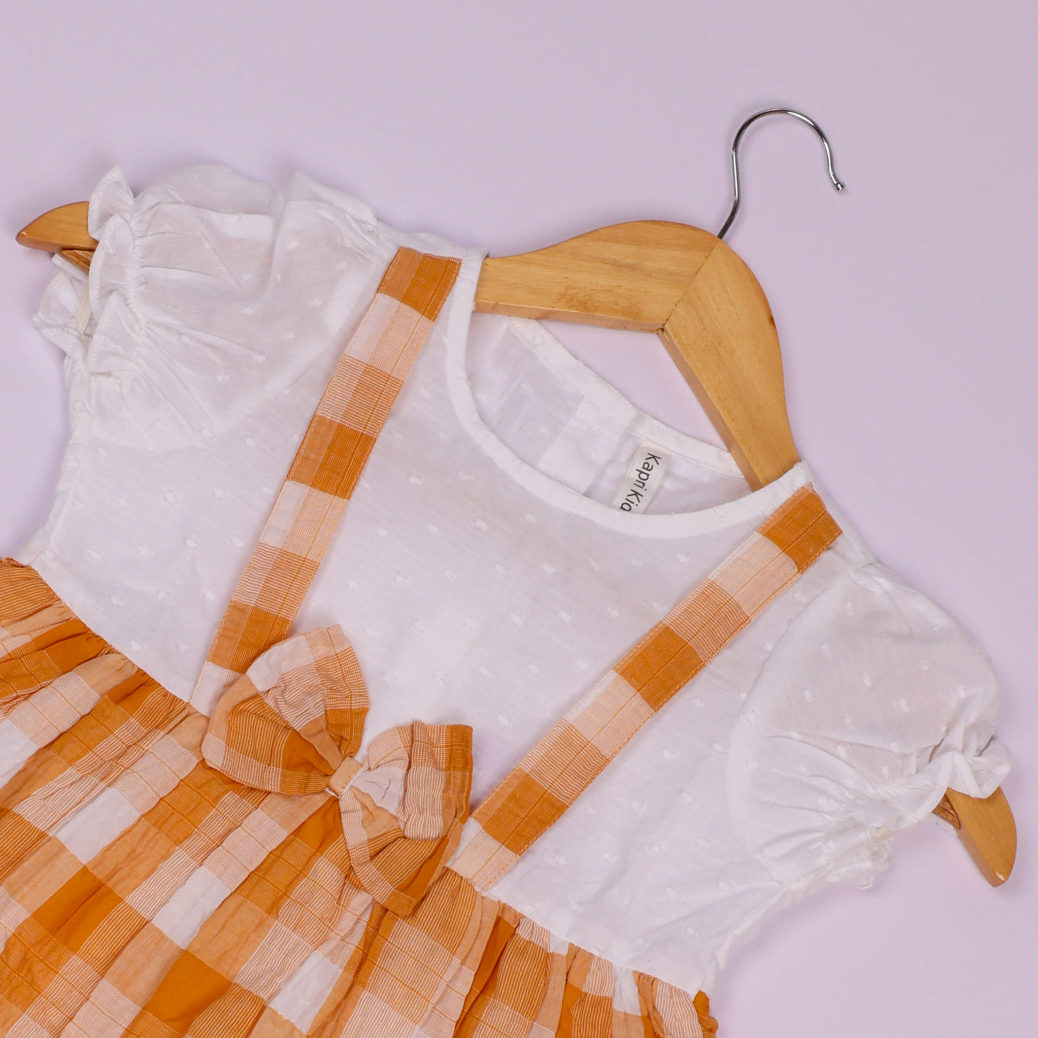 Crafted with love and care, the dress features a soft cotton blend fabric that feels gentle on delicate skin. The white dotted top with puff sleeves adds a cute, playful touch, while the orange-checked suspender skirt brings a fresh, cheerful vibe. The bow detail at the waist completes the look with a sweet finish, making it a must-have addition to your child’s wardrobe.